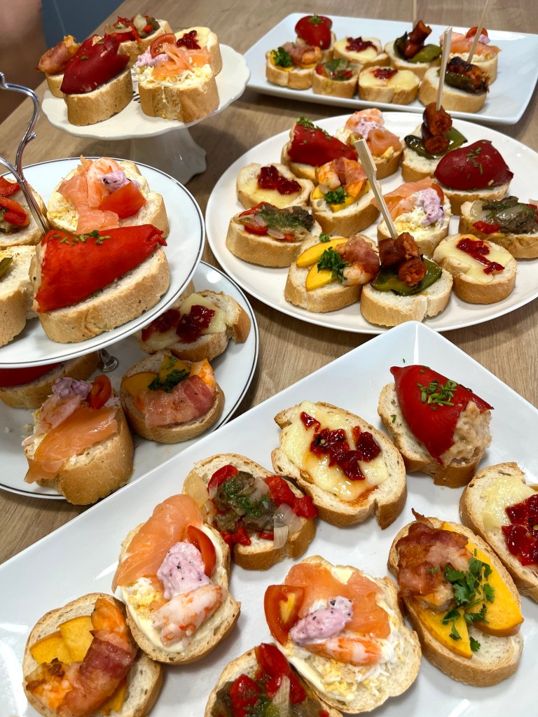 Para hacer la escalivada horneo una cebolla,un pimiento rojo y una berenjena enteros hasta que estén bien hechos a 180 grados. Espero a que estén tibios y pelo las berenjenas y el pimiento y corto todo en tiras. Un poco de aceite de oliva y sal por encima.