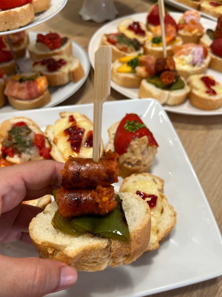 Poco hay que explicar. En una sartén con un poco de aceite fríes los trozos de pimiento y luego le toca el turno a la chistorra.