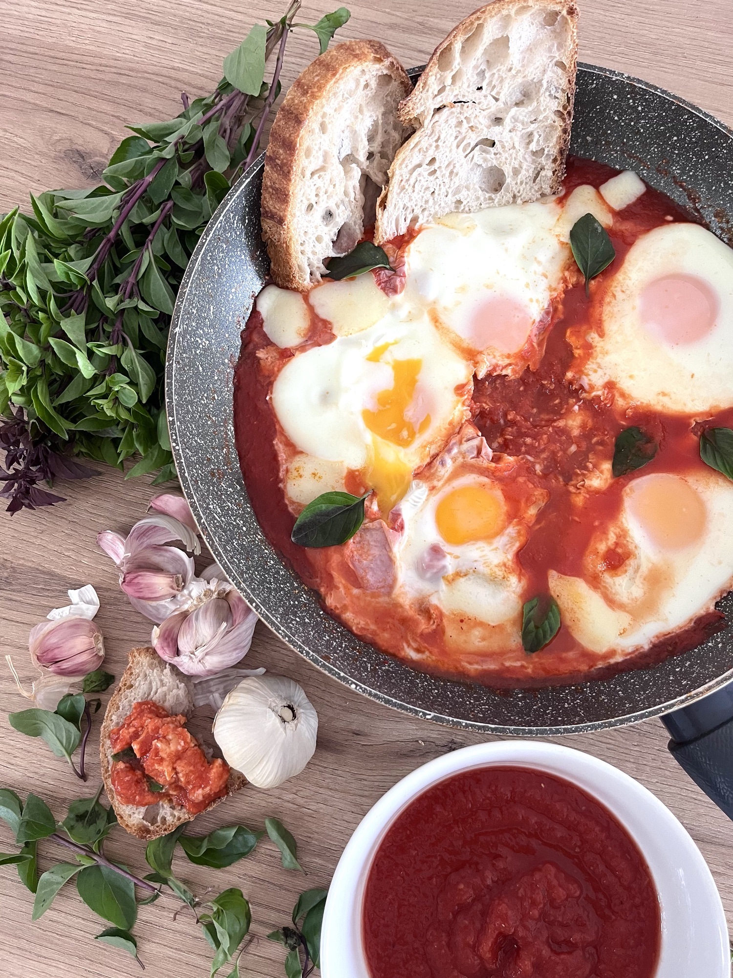 Esta versión queda deliciosa, imagina queso bien derretido, tomate, huevos, todo con mucho chup chup, el aroma que impregna toda la casa y la rebana de pan de masa madre preparada para remojar bien dentro de la sartén. Porque es lo único que necesitas, una sartén, 15 minutos y estos productos.