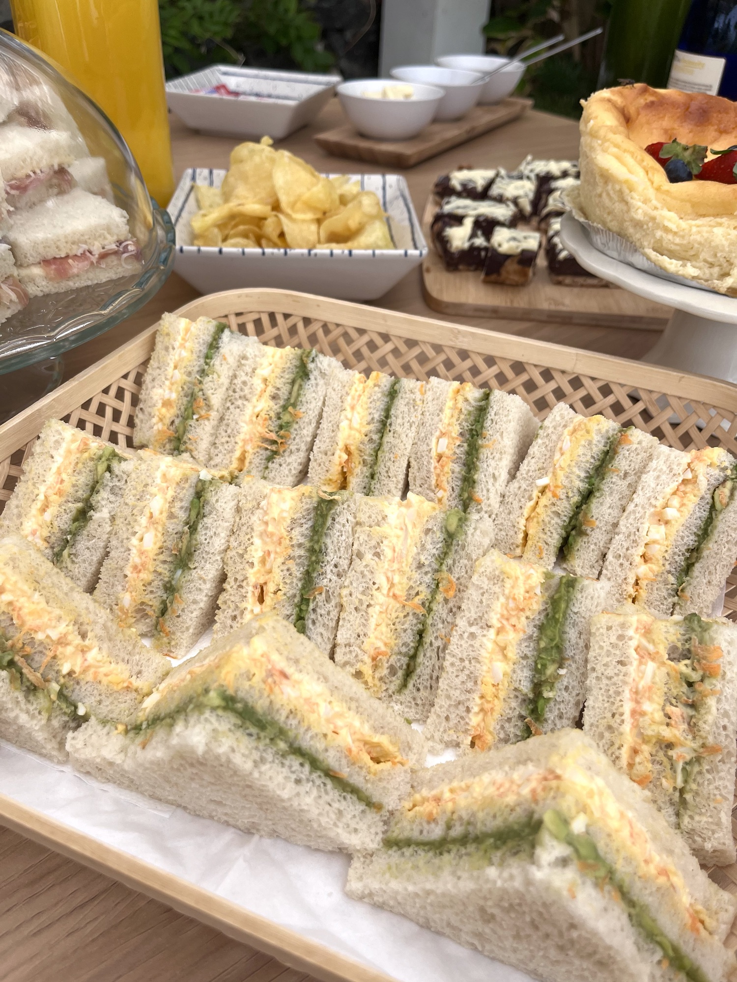 Sandwiches triples de aguacate, huevo y zanahoria.