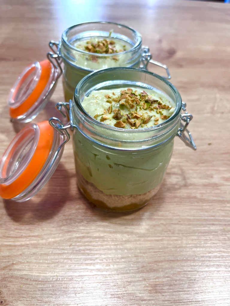 Vasitos de crema de pistacho,galletas y mermelada de mango