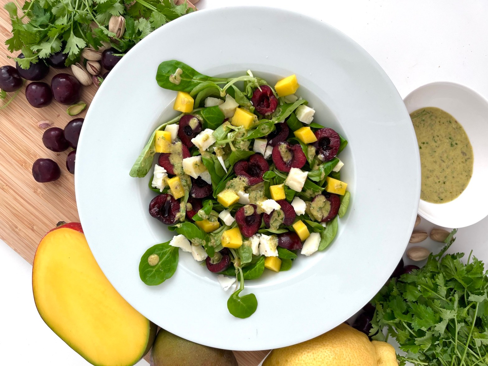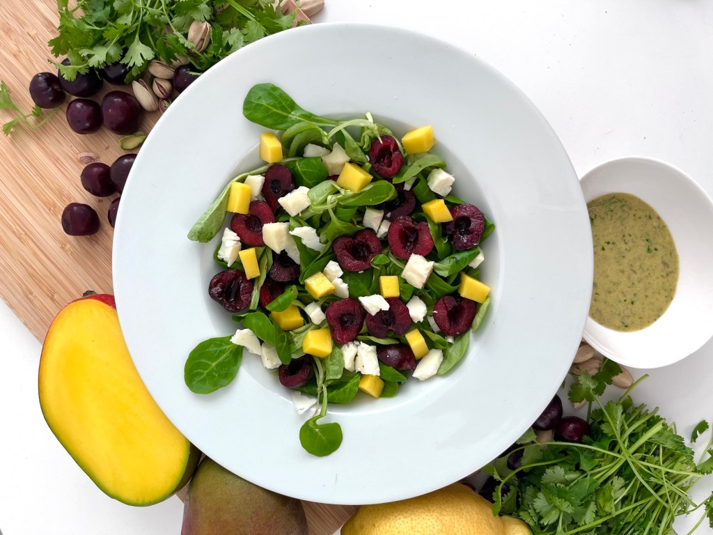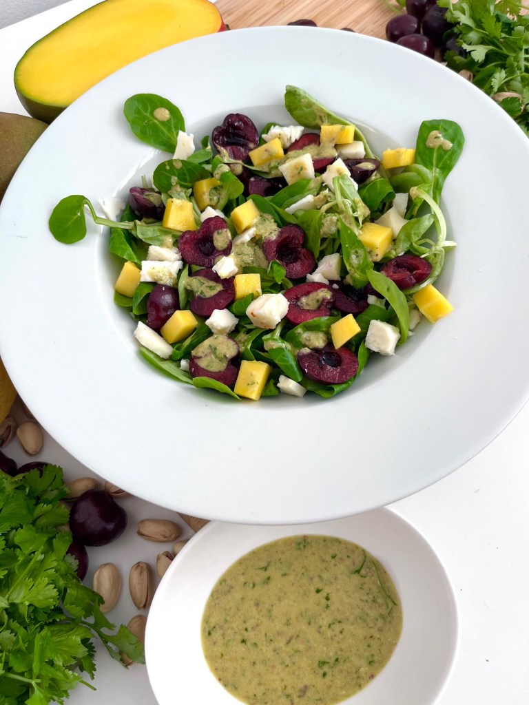 Ensalada de cerezas, queso y mango con aliño de pistacho y cilantro