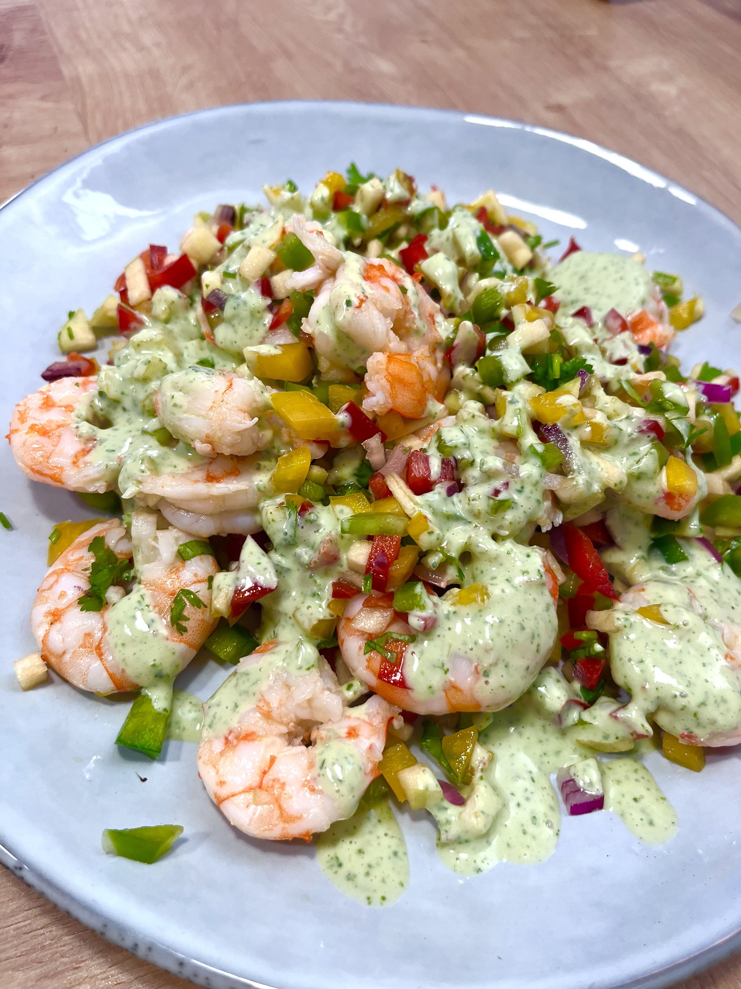 Ensalada de gambas con manzana y aliño de yogur ligera, la puedes dejar preparada el día anterior y te vale de cena, de almuerzo y hasta para rellenar sándwiches o unos huevos duros.