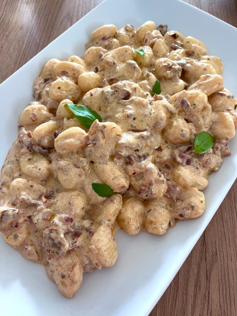 Gnocchi con tomate seco y cebolla roja tardé más en escribir la receta que en hacer le plato.