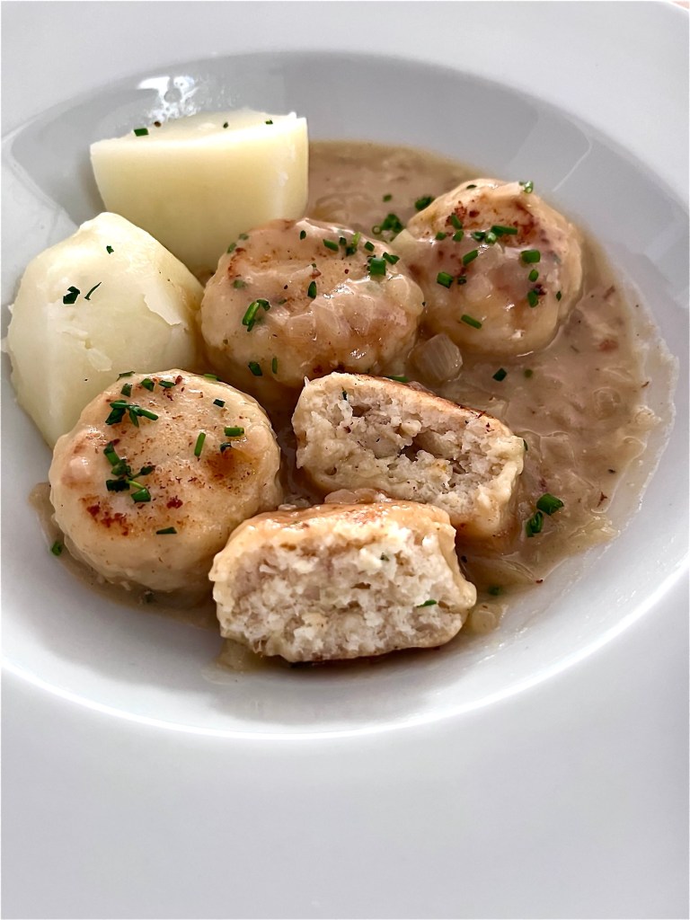 - Pon la mitad en un procesador de alimentos junto al pescado, el huevo, la rebanada de pan de molde previamente mojada en leche y escurrida (no dejes mucho líquido de la miga que luego no se te forman las albóndigas),la sal, la pimienta y el cebollino. Tritúralo todo hasta conseguir una masa.