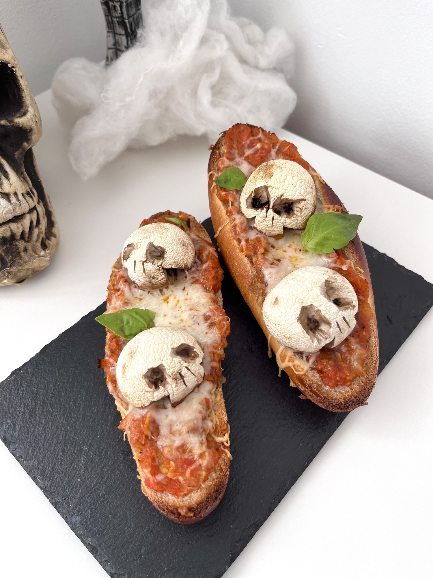 - Corta los champiñones frescos bien limpios con forma de calavera. Y ponlas sobre el queso.