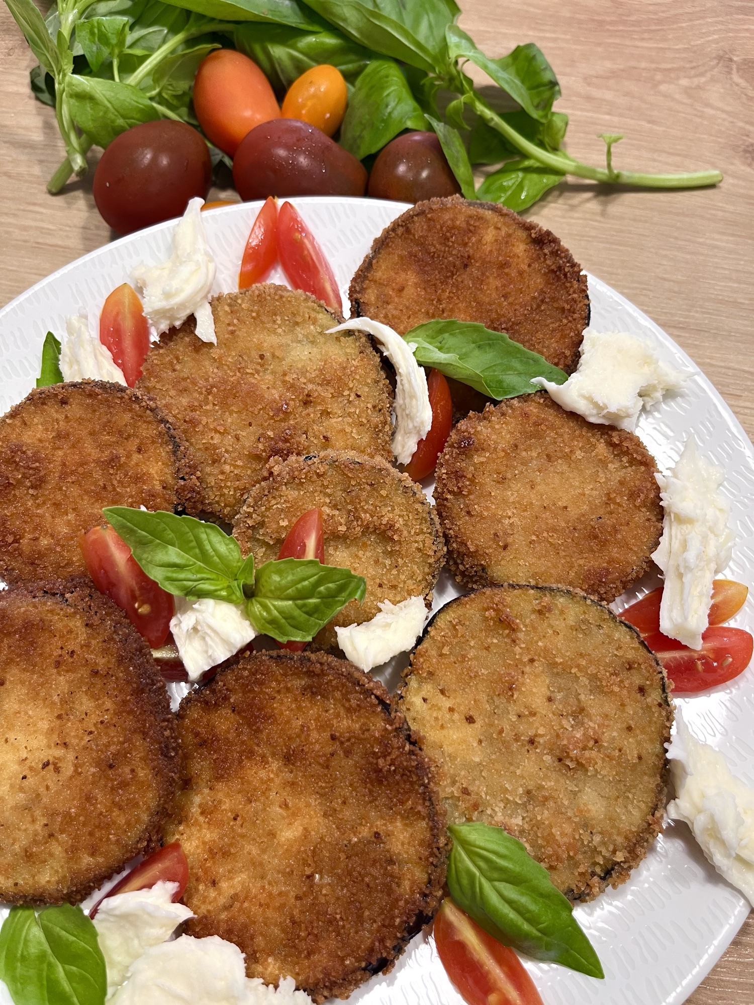Berenjenas empanadas con tomates cherries, mozzarella y albahaca