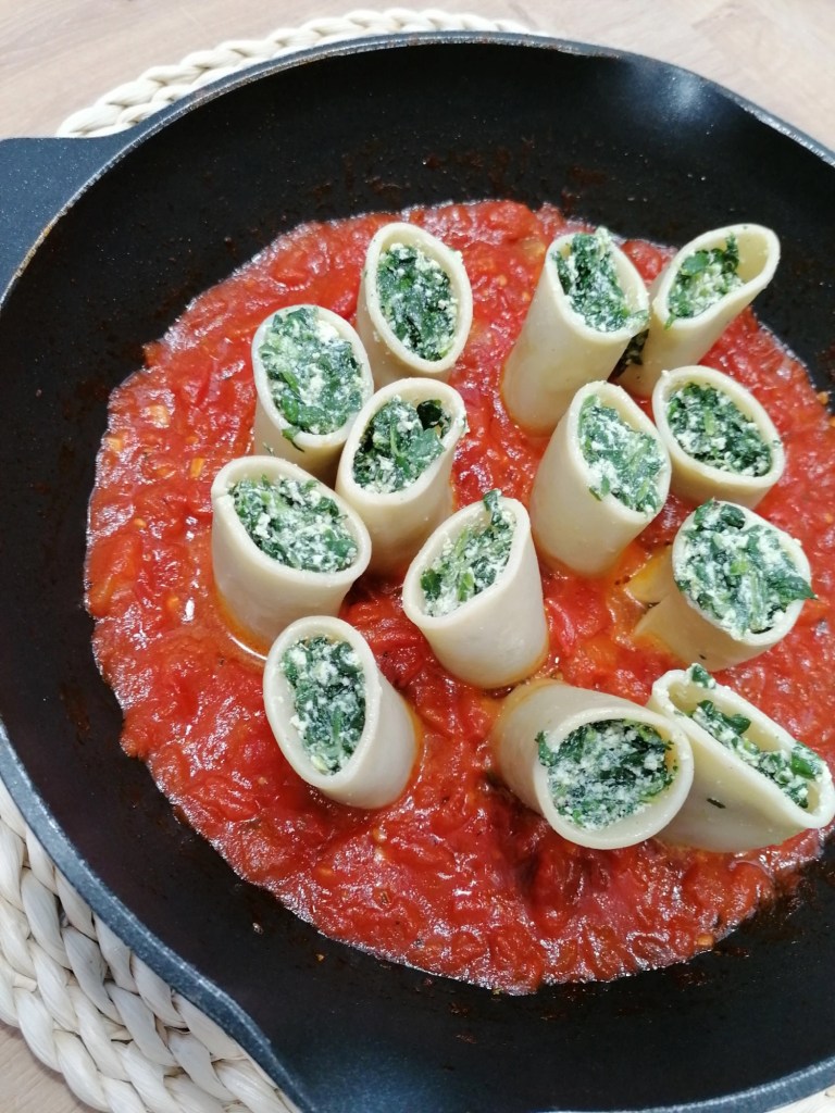 Paccheri rellenos de espinacas y ricotta un plato genial para invitar a alguien a comer, puedes dejar todo preparado antes y darle el toque final a última hora.