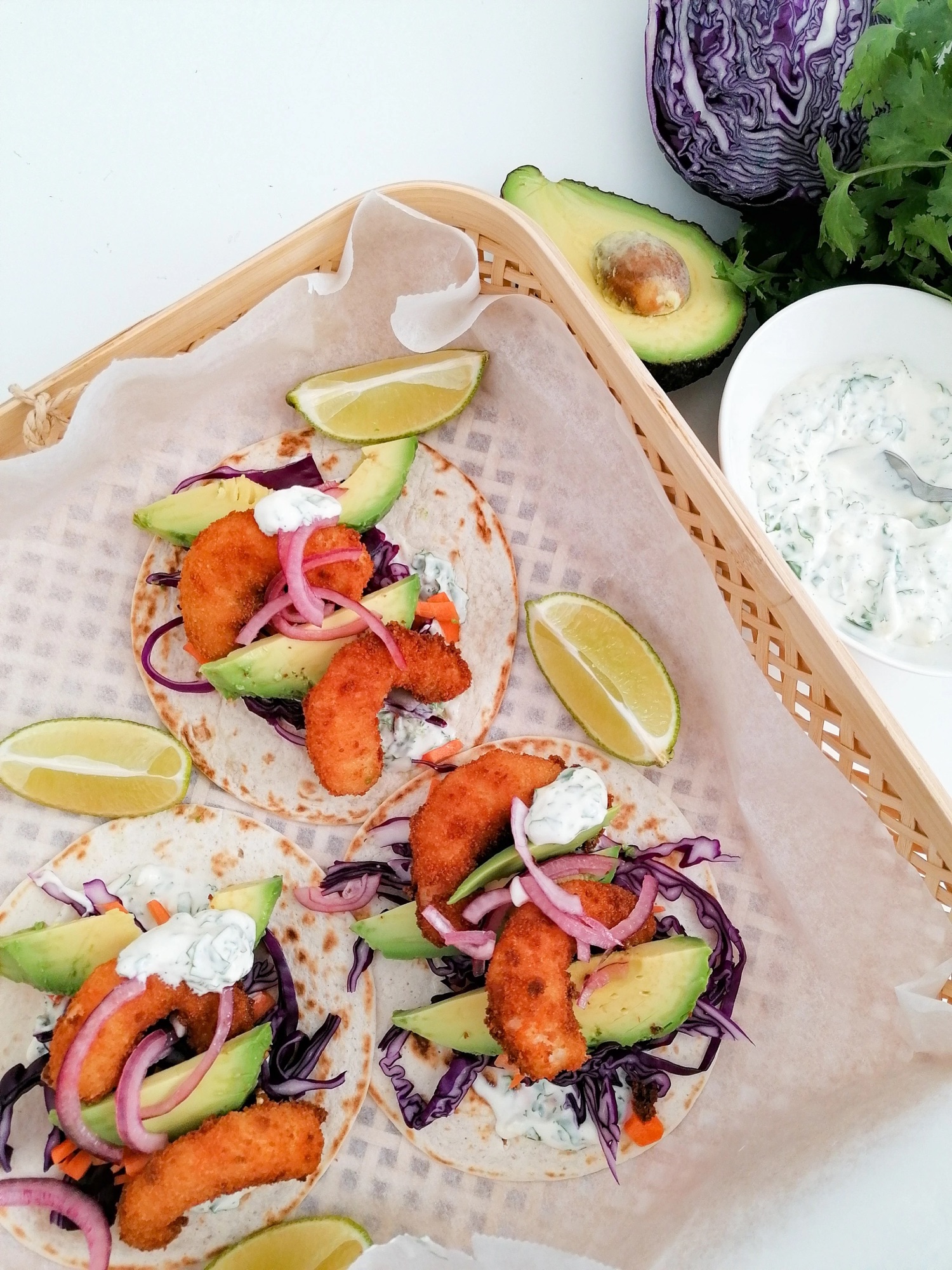 Se me hace la boca agua con solo mirar estos tacos de gambas, ese empanado y esa salsa son pura alegría de vivir.