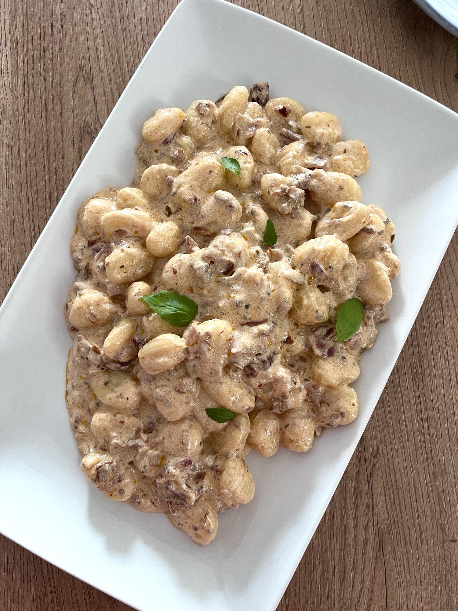 Estos gnocchis con tomate seco y cebolla roja son siempre bienvenidos y para mí es un plato de fiesta.