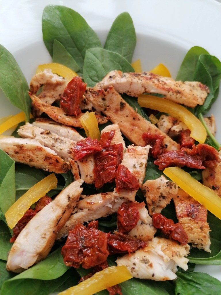 Ensalada de pimiento amarillo, tomates secos y pollo con bien de espinacas te hará feliz porque se trata de lanzar cosas a un plato sin más.