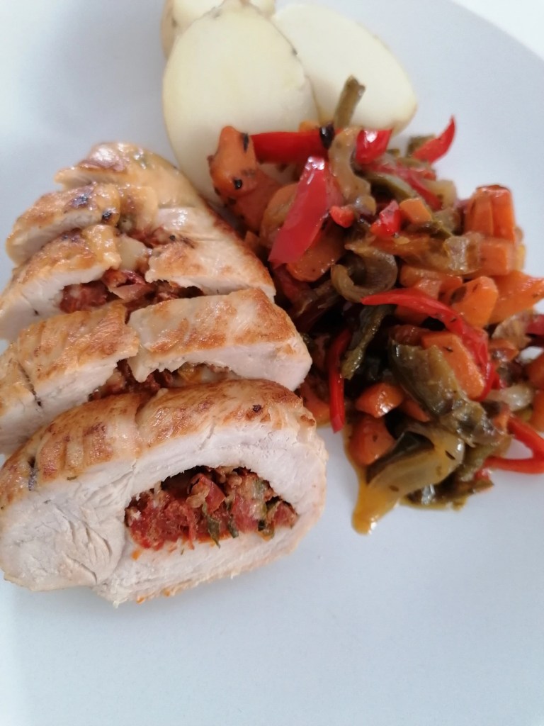 Si estás aburrida de la vida con una triste pechuga de pollo Pues te dejo esta idea con rellena con queso y tomate seco.