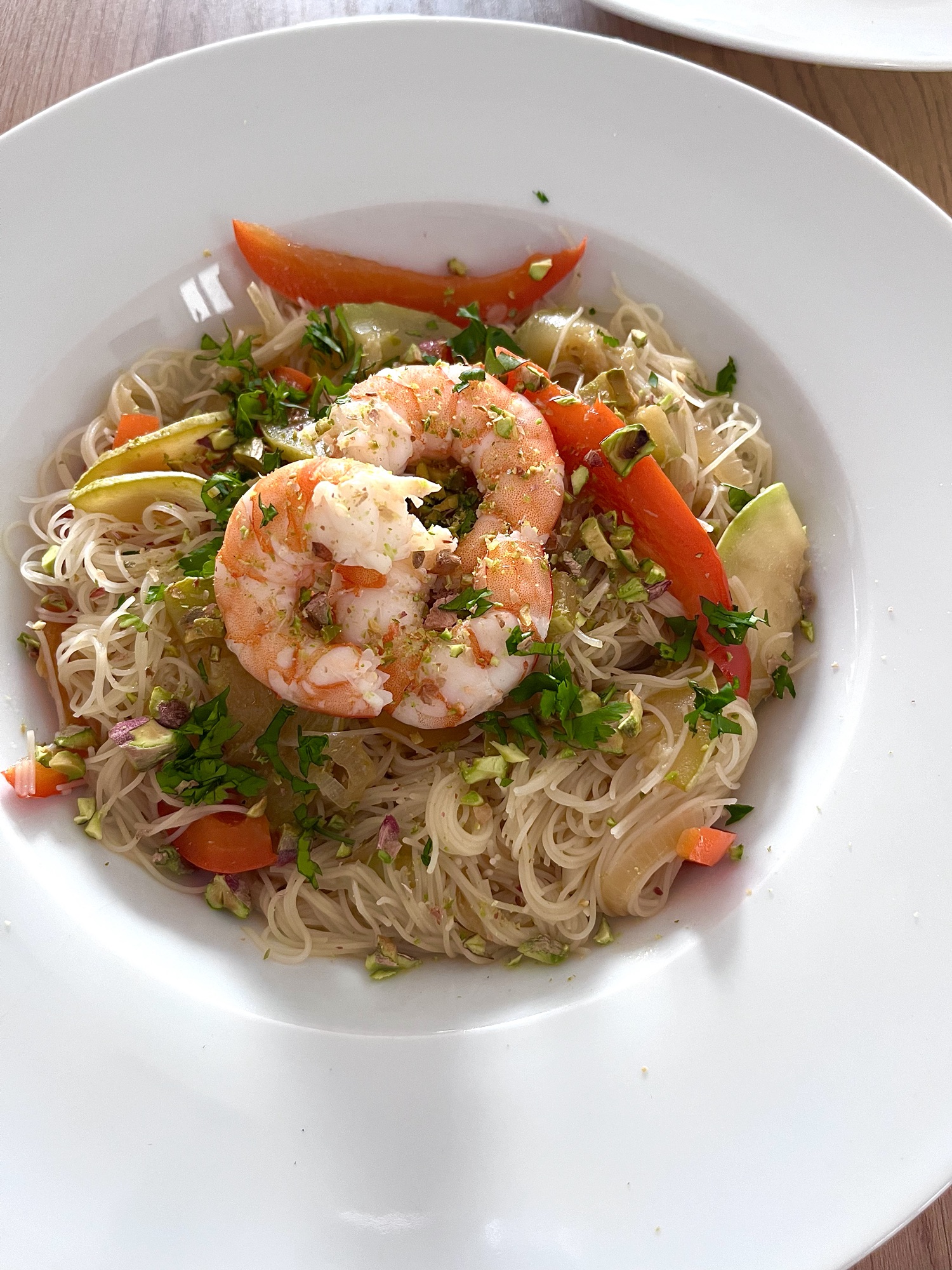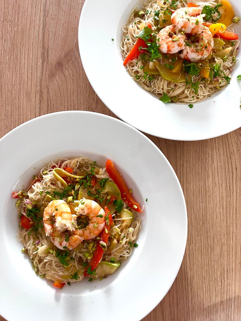 Fideos de arroz con gambas y pistachos