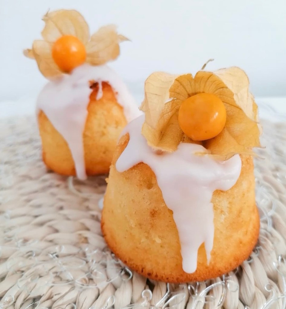 Estos miniqueques maravilloso tiene dentro alquequenjes. Están hechos con esta receta de queque de naranja sin lácteos, lo que le puse dentro trocitos de physalis o alquequenjes.
