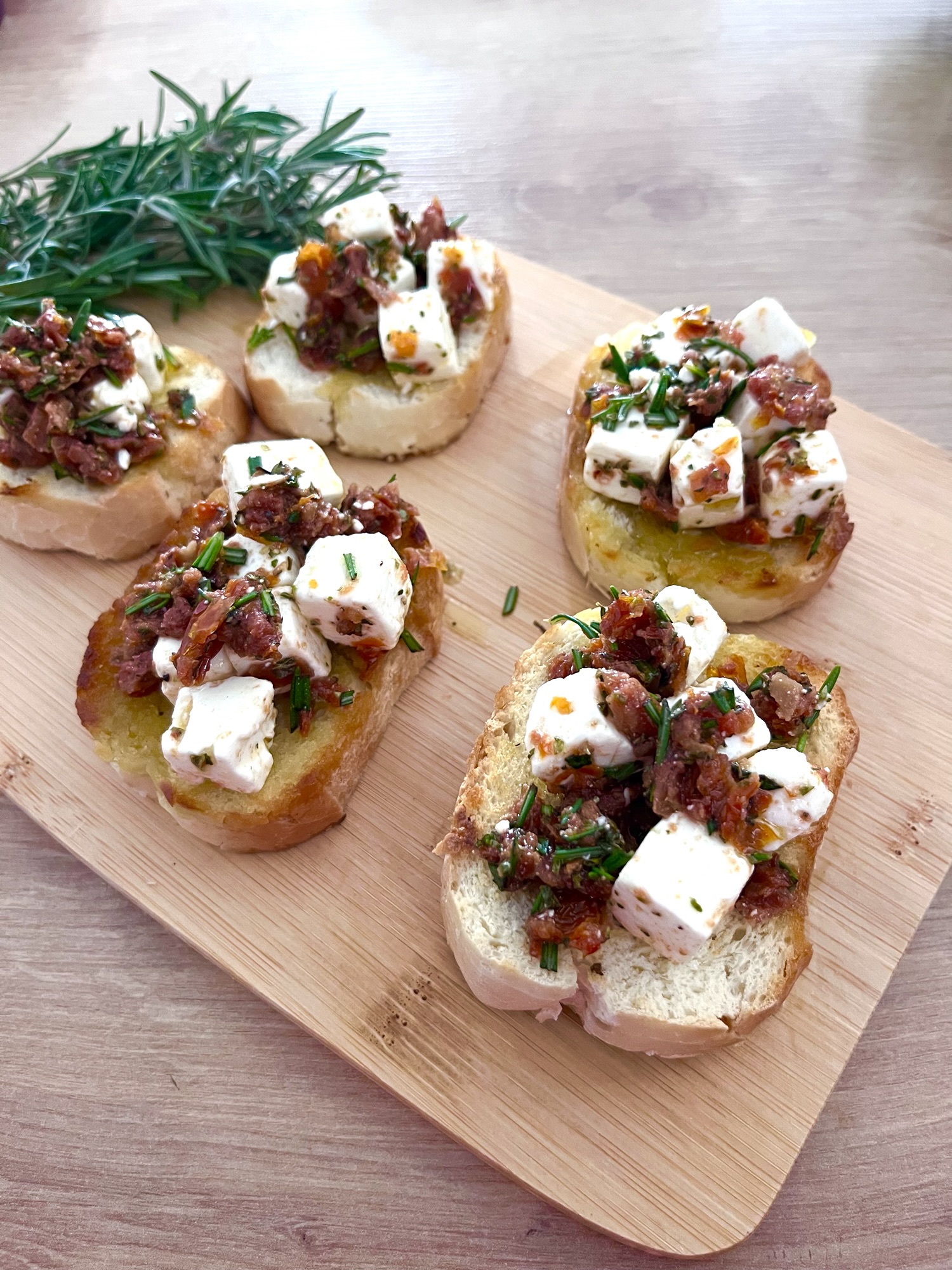 - Servir el queso mezclado con el aliño sobre las rodajas de pan.