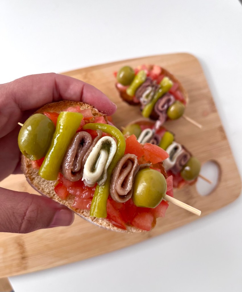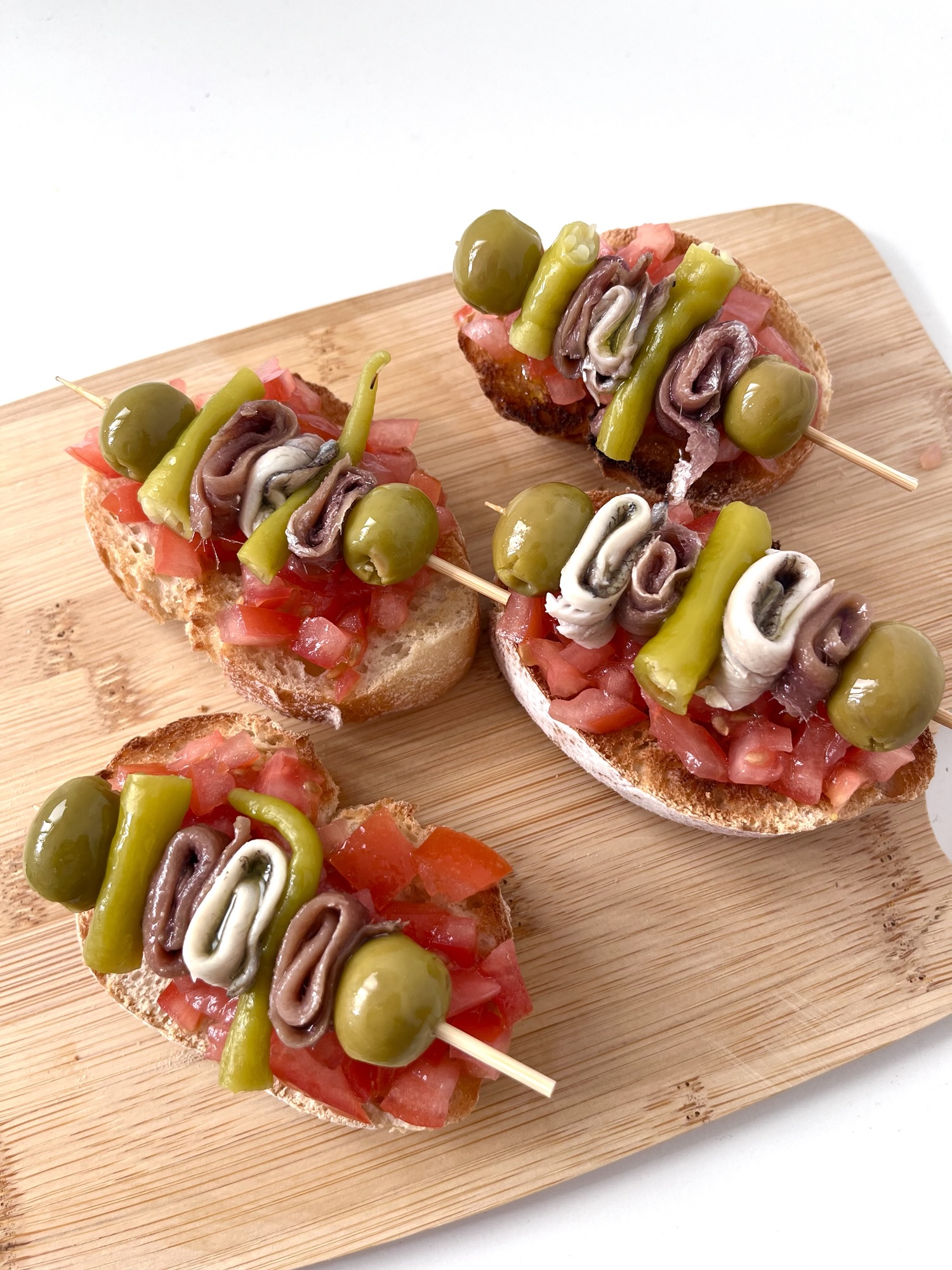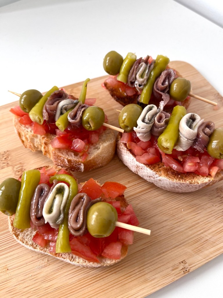 - Haz una banderilla con ayuda de un palillo de madera donde alternes las aceitunas, las guindillas, las anchoas y los boquerones a tu gusto.