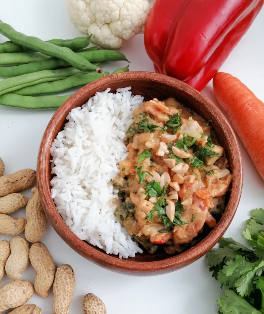 Verduras salteadas con salsa de coco y cacahuetes, una manera distinta de comer verduras, que no requiere de ninguna habilidad culinaria y que aguanta muy bien en nevera.