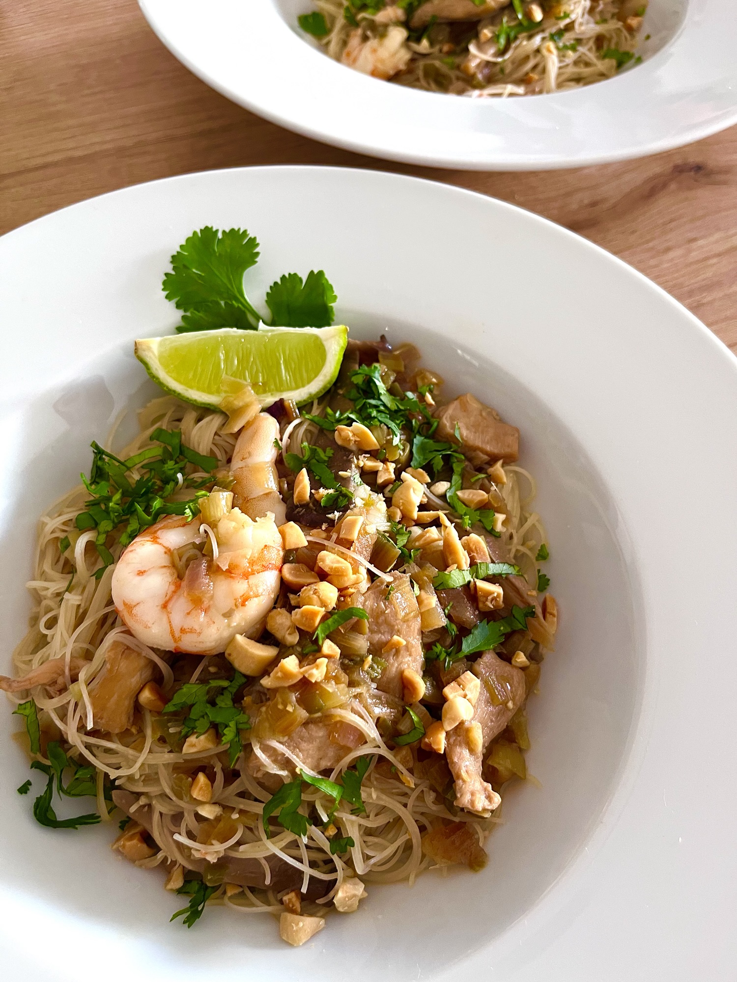 Estos fideos de arroz con gambas y pollo, ligeros, sabrosos y encima saludables. Díganles hola, por favor.