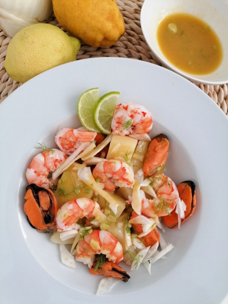 Ensalada de papas,hinojo, gambas y mejillones
