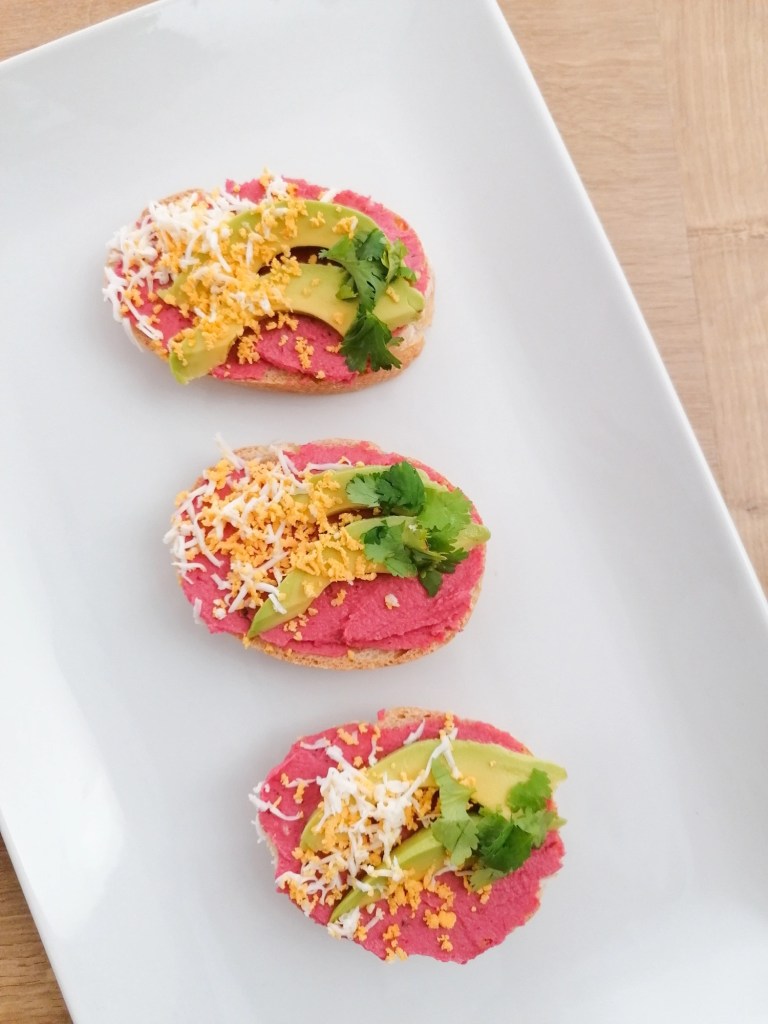 Esta tosta de hummus de remolacha con aguacate, huevo y cilantro es perfecta para desayunar o cenar.