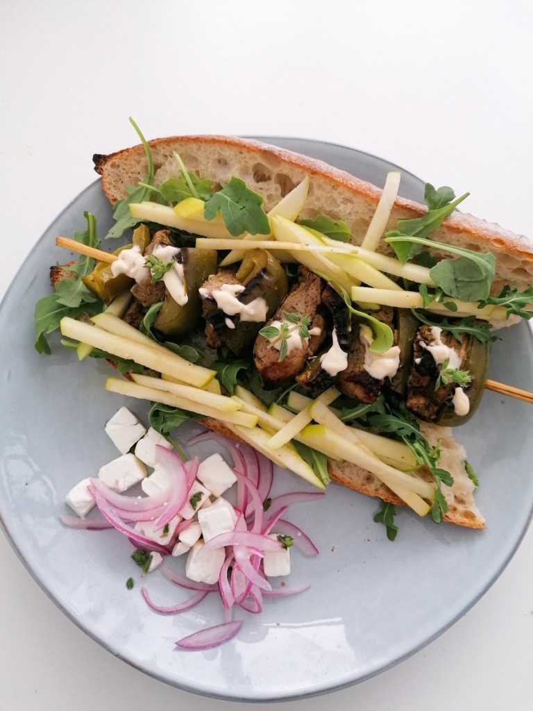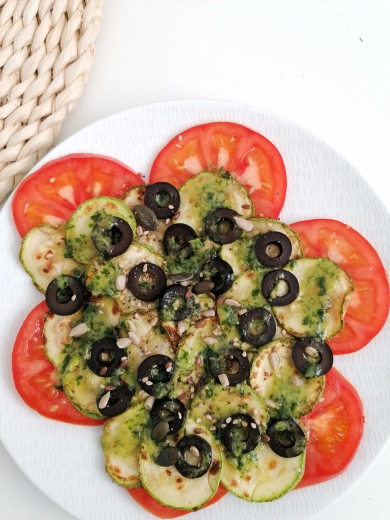 Ensalada de tomate, calabacín y aceitunas negras con mojo de cilantro.