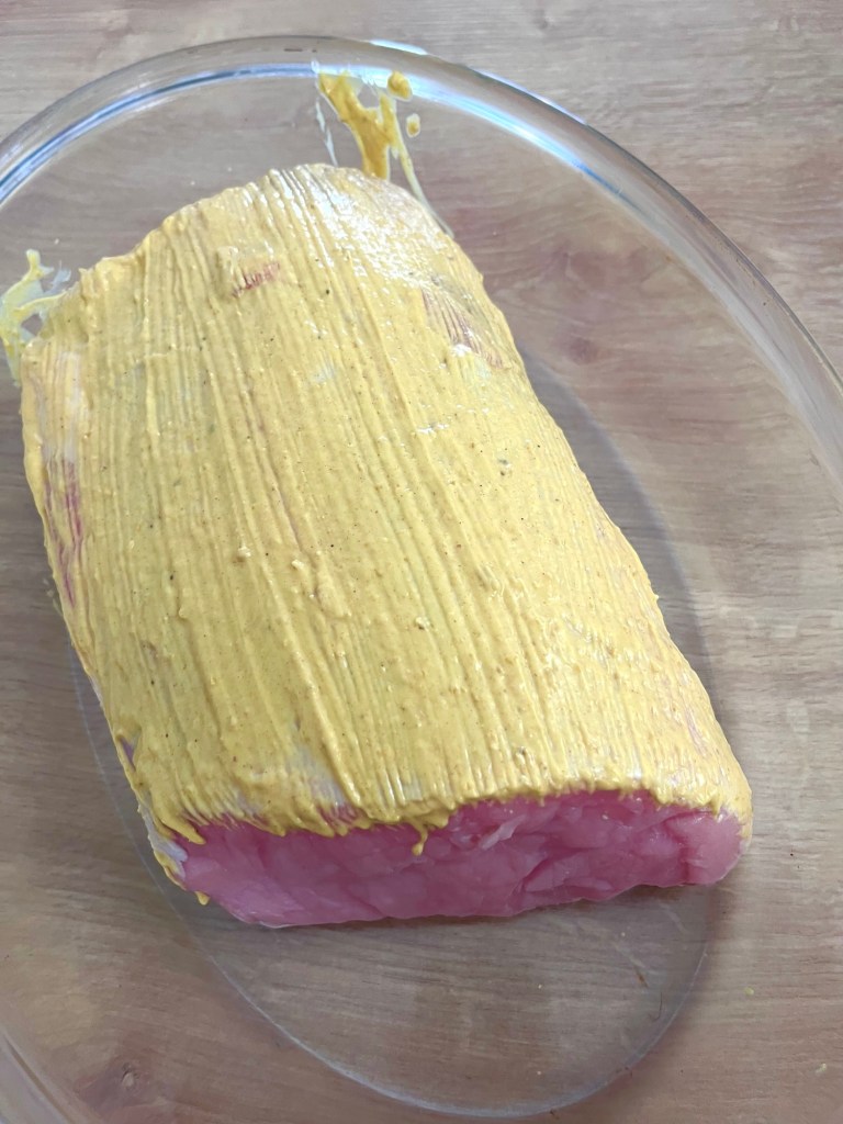 - Pinta con tu mostaza favorita una pieza de lomo de cerdo hasta que quede completamente cubierta.