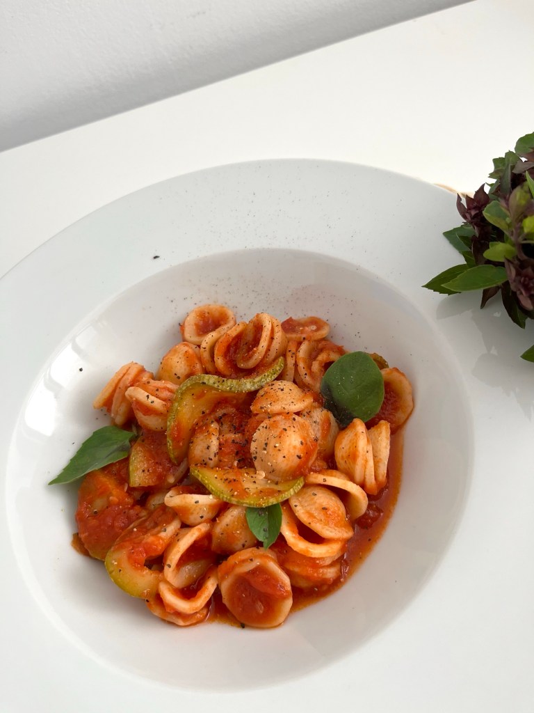 Esta pasta con salsa de tomate y calabacín,es de esas recetas que me gustan, porque es sabrosa, barata, sencilla y se prepara rápido, puedes sustituir los oriechette por cualquier pasta que te guste.