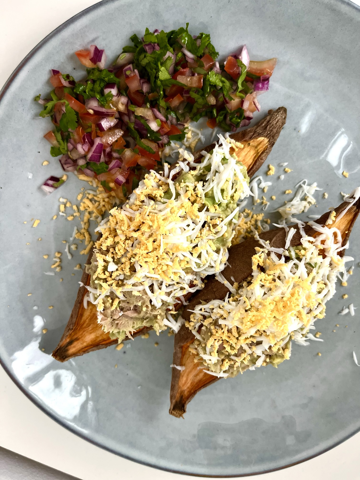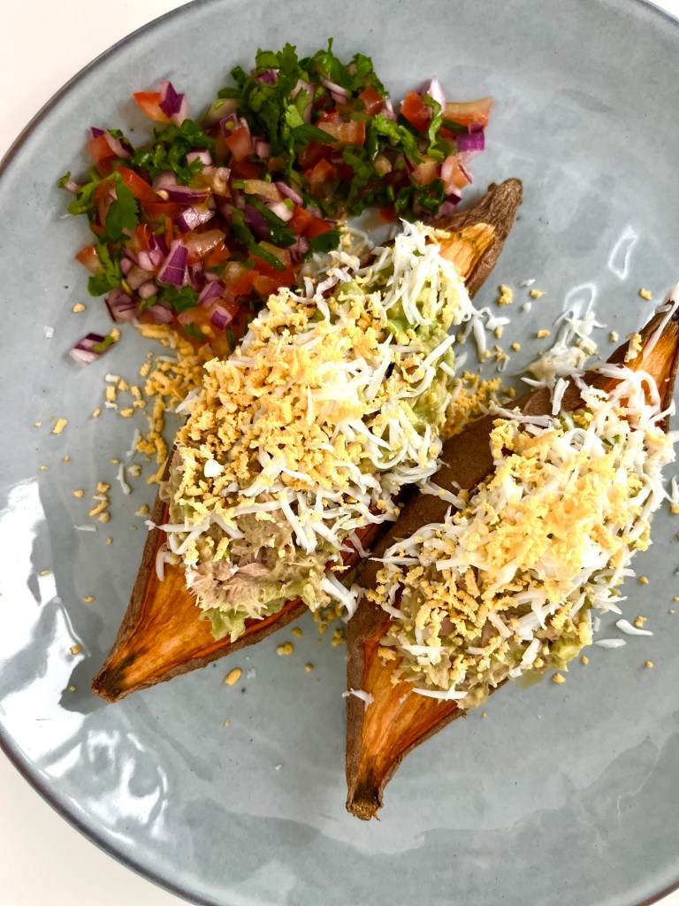 - Sirve la batata con la mezcla por encima de aguacate y atún, coronado con el huevo duro rallado y acompáñalo con la picada de tomate, cebolla, cilantro y limón.