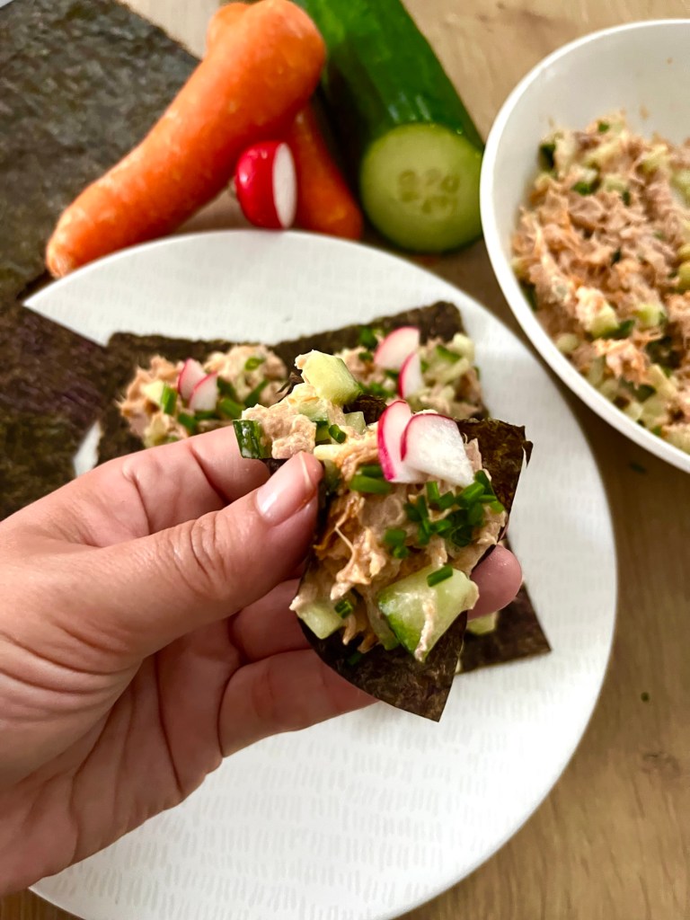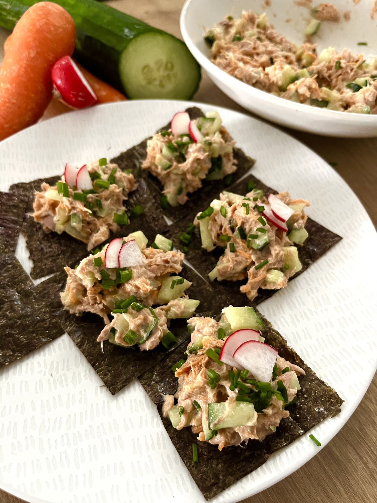 - Corta las láminas de algas nori en cuadrados, es ideal que queden del tamaño de un bocado. Ponle por encima el relleno de atún y sirve con un poco más de cebollino fresco por encima y unas rodajas de rábanos o de aguacate, ponle lo que te apetezca.