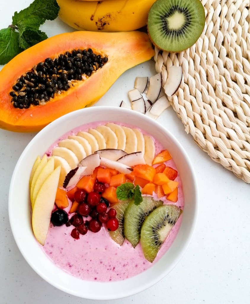 2. Por encima le pones la fruta que más te guste. Este lleva coco, kiwi, papaya, plátano, manzana y más frutas del bosquecillo.