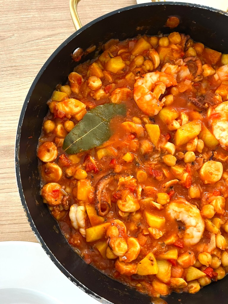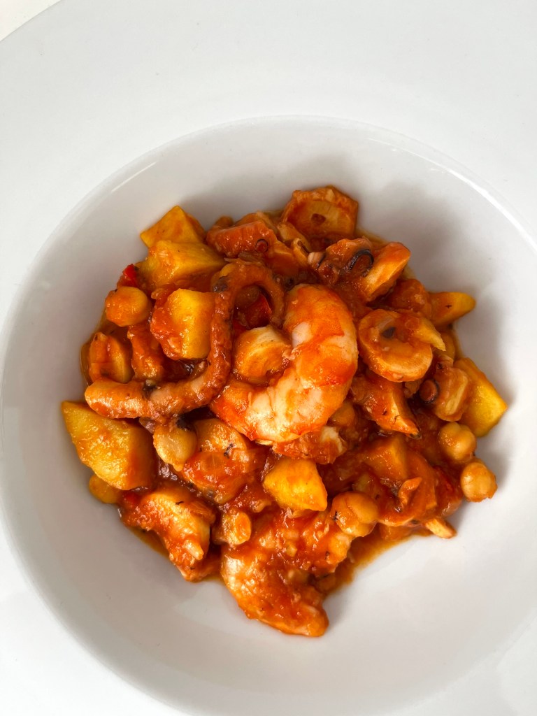 Ropa vieja de pulpo y gambas