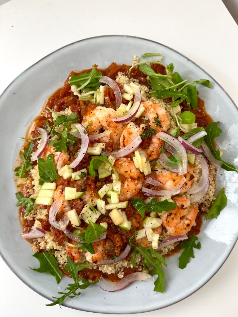 🌱🦐🍏Quinoa con salsa de tomate especiada, gambas, cebolla y manzana verde 🍏🦐🌱🍅