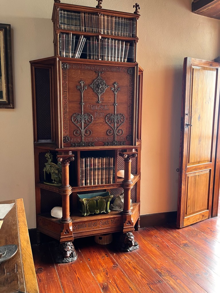Tres baldas al aire con el triple de grosor de las normales y el mueble en la parte inferior con puertas correderas, parece un mueble de Ikea al lado de los suyos, el mío no tiene inscripciones en latín ni azulejos pintados a mano. Pero sí que hay algunas de sus obras ahí junto a Isabel Allende.