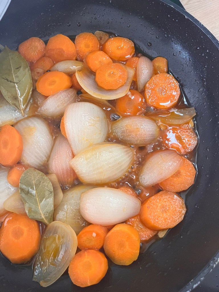 - Corta la cebolla en cuatro partes y separa las capas. Pela y corta la zanahoria en rodajas no muy finas. Tienen que ser lo suficiente gruesas para que una vez cocidas las puedas insertar en un palillo. Sofríelo todo con aceite de oliva.