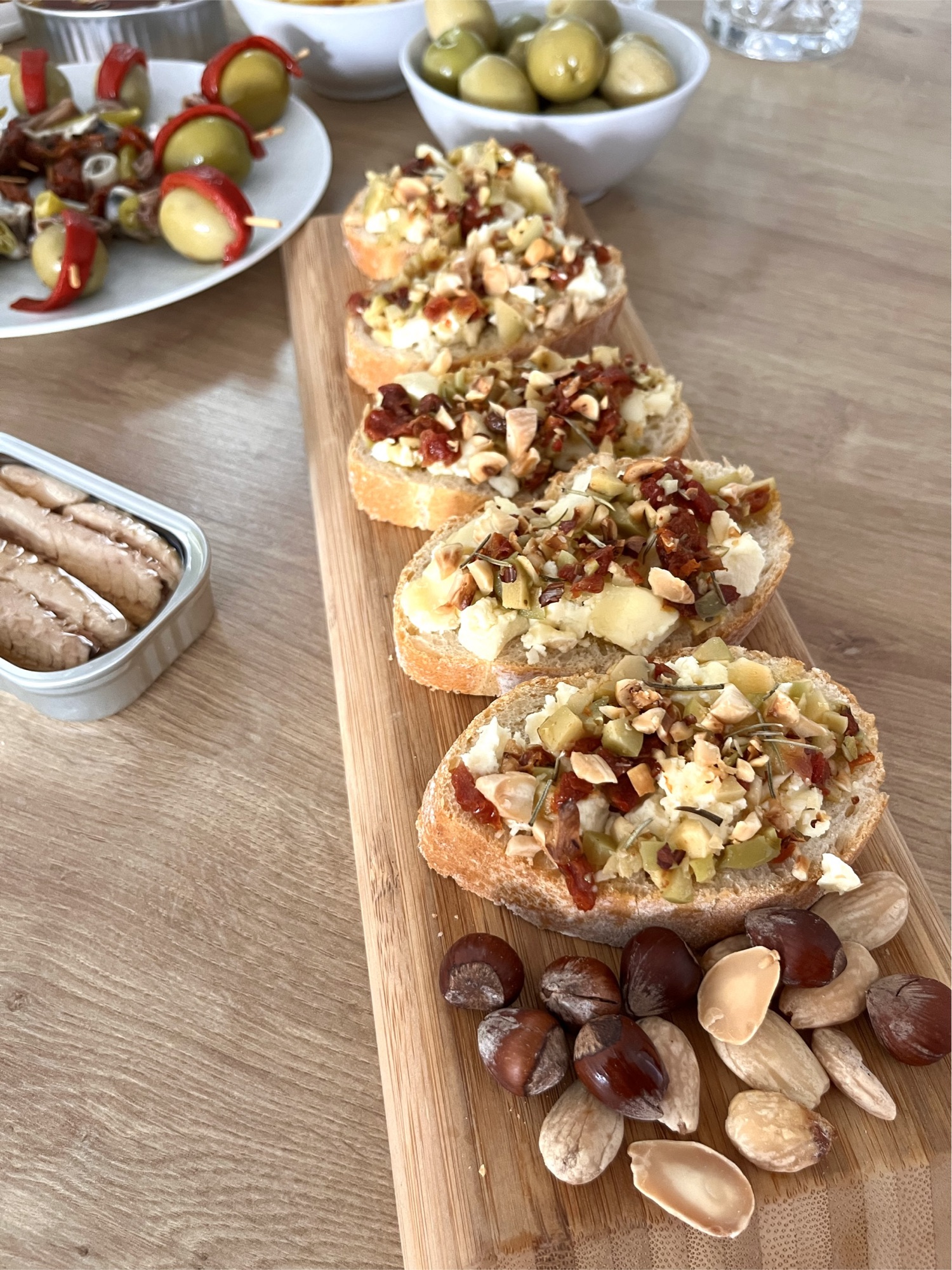 Tosta de queso, tomate seco y aceitunas con frutos secos.