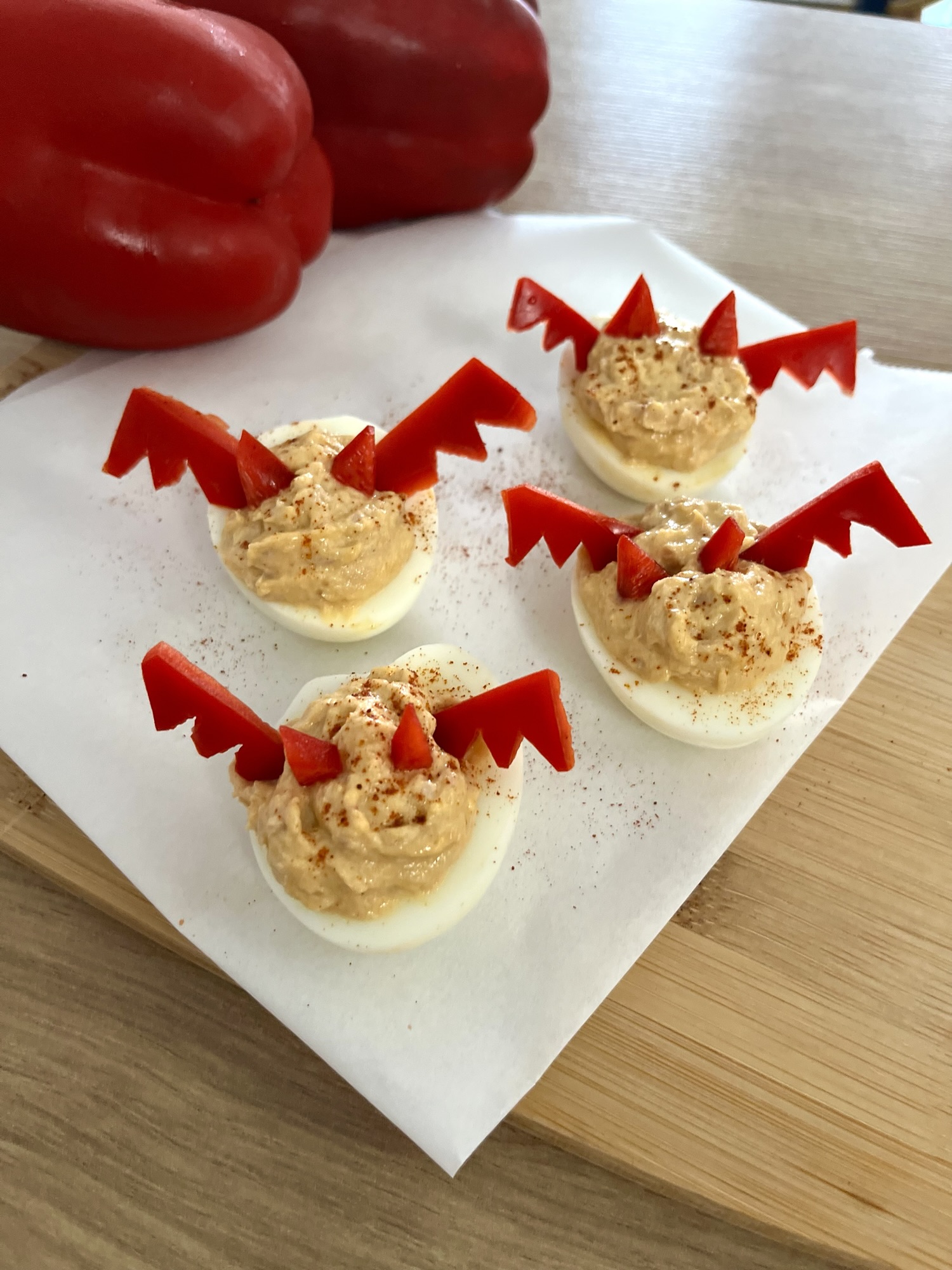 4️⃣ Corona los huevos con trozos de pimiento rojo en forma de cuernos y alas 😈🔥.