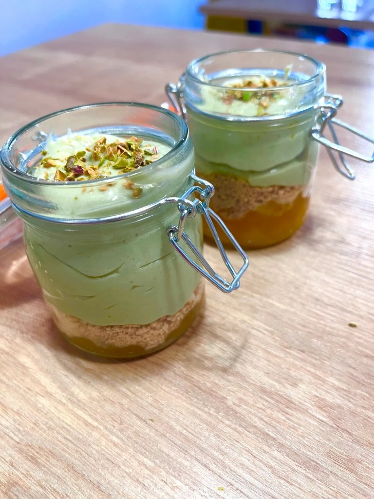 No seré yo quien los deje sin postre. Estos vasitos de crema de pistachos y mermelada de mango quedan lindos, ricos y son geniales para regalar o llevar de detalle a alguna cena.