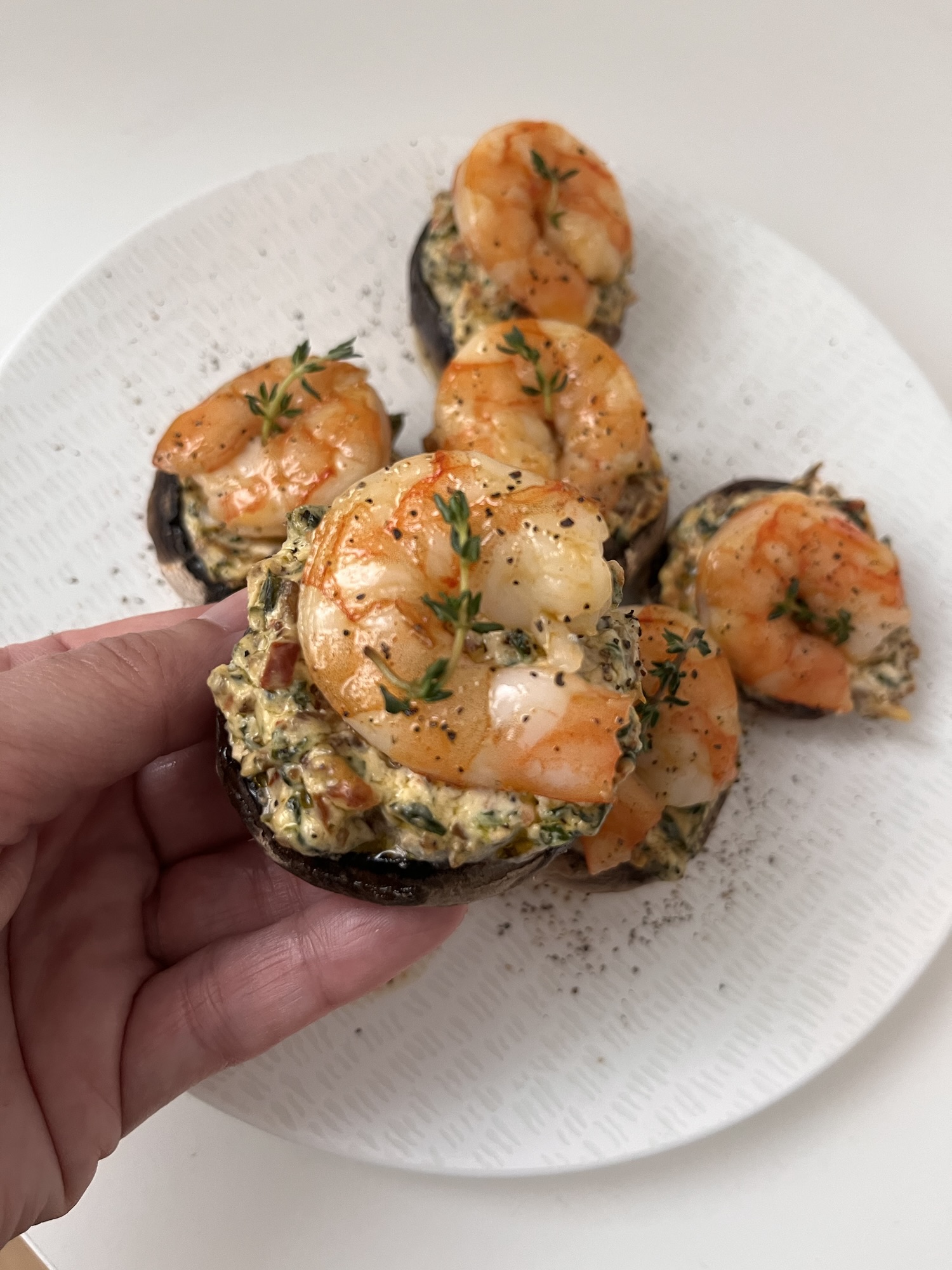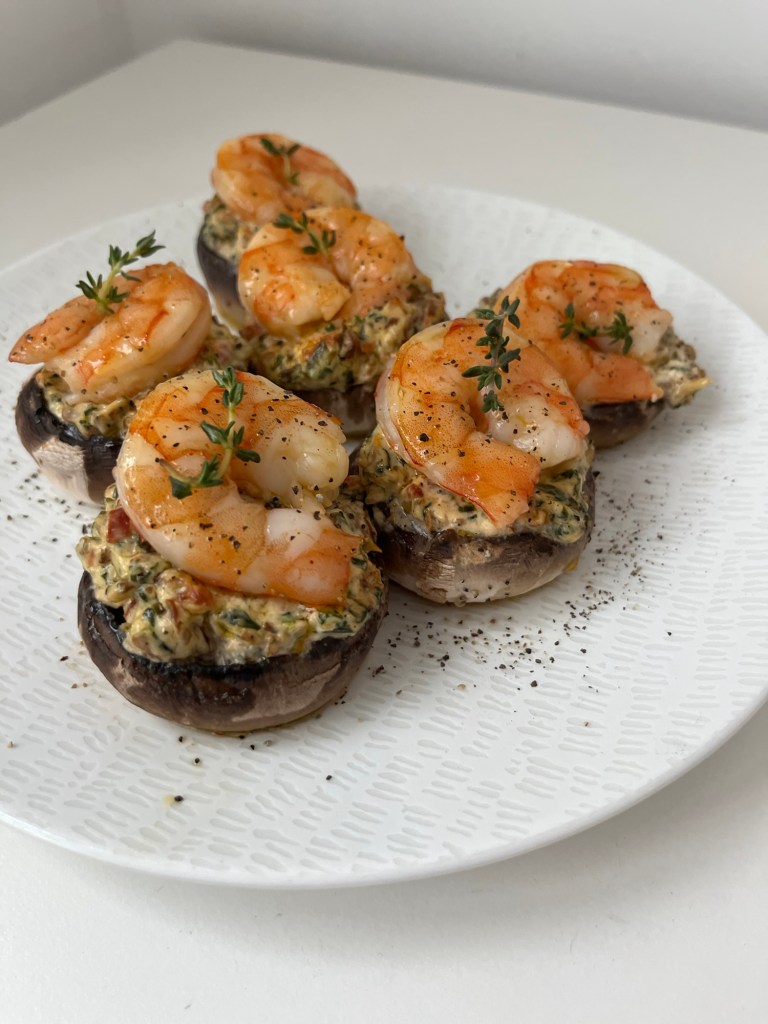 🍄✨ Champiñones rellenos de queso, espinacas y tomate seco con gambas