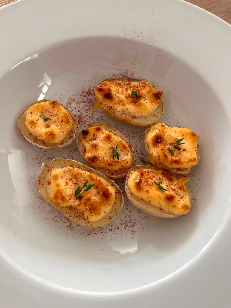2️⃣ Corta las papas arrugadas por la mitad y pon un poco de la mezcla por encima.