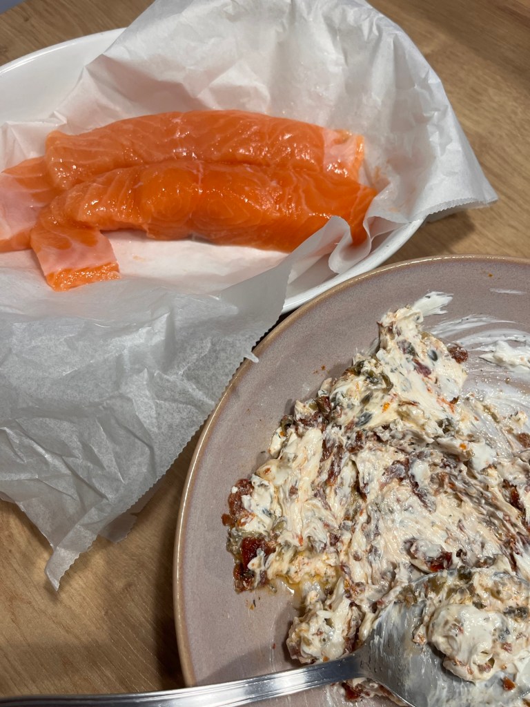 2️⃣ Mezcla el queso crema con el tomate seco picado, las alcaparras y el eneldo.