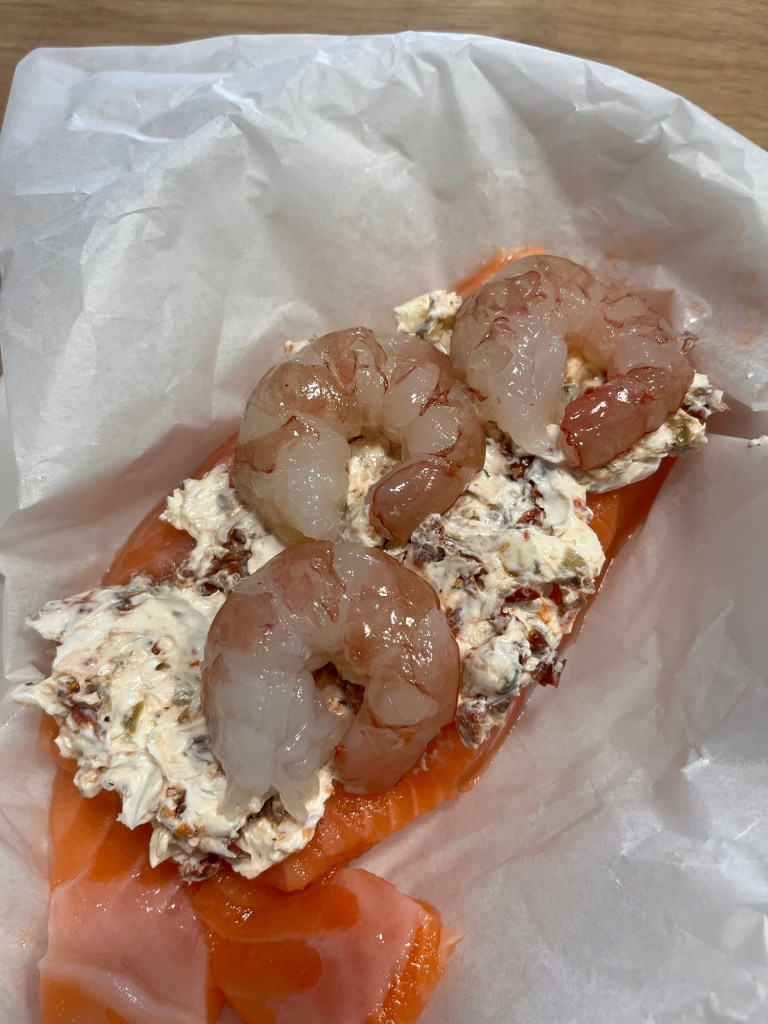 4️⃣ Cubre el salmón generosamente con la mezcla y coloca las gambas limpias por encima.