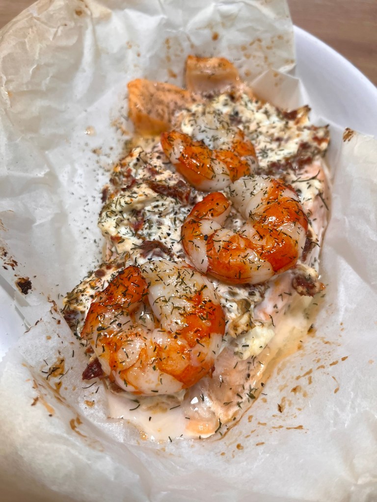 Así que saqué muy temprano un par de trozos de salmón del congelador y el puñado de gambones que había comprado de oferta y me fui a trabajar.