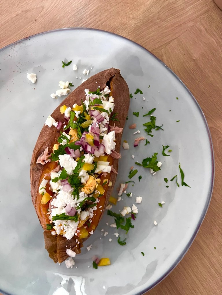 La batata asada rellena siempre me sabe a fiesta, a capricho, a placer absoluto. Soy fan vaga que la dejo asada por la noche y al día siguiente solo tengo que recalentarla y rellenarla de lo que me apetezca.