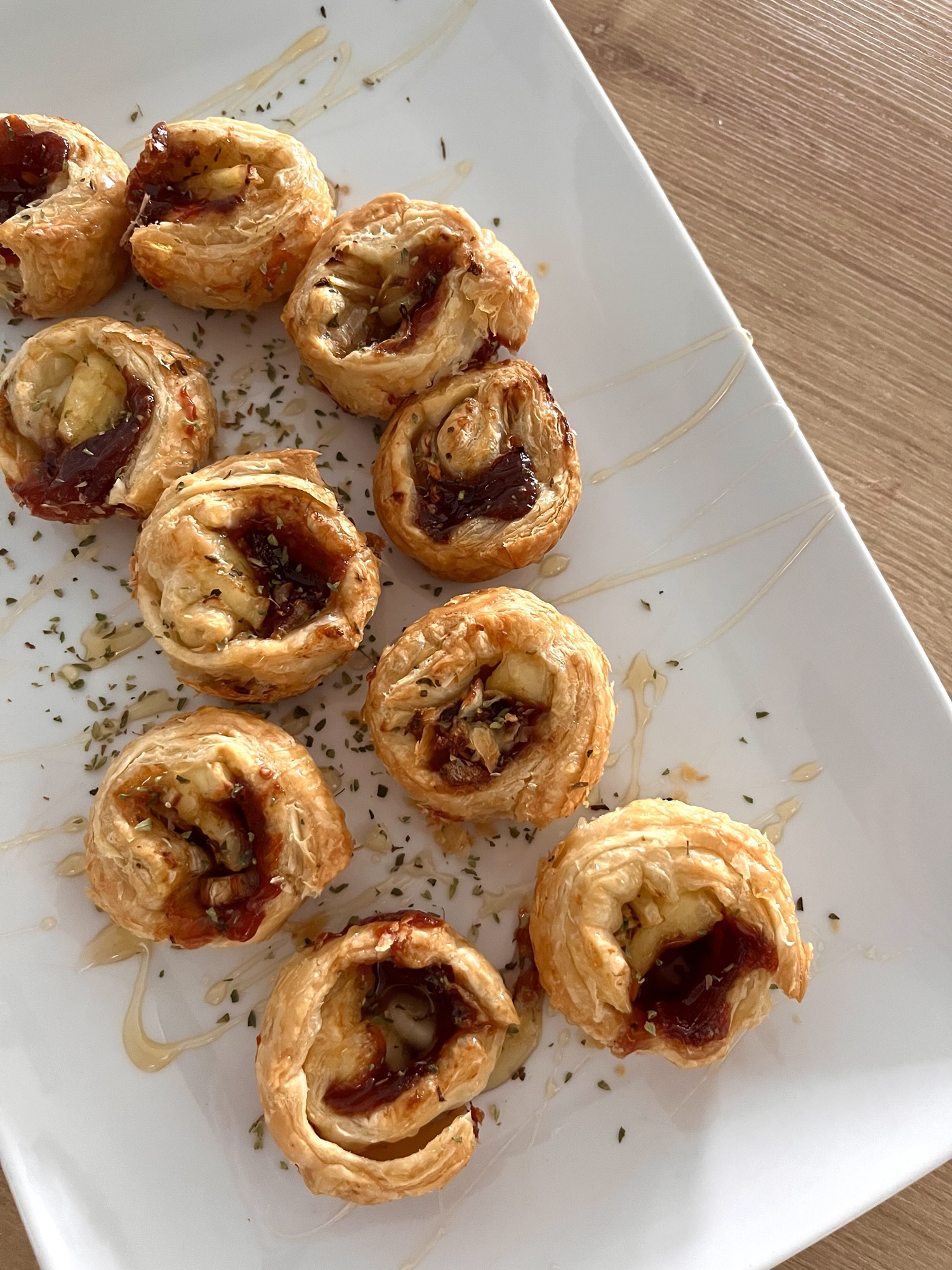 Bocaditos de hojaldre, brie, jamón serrano y mermelada