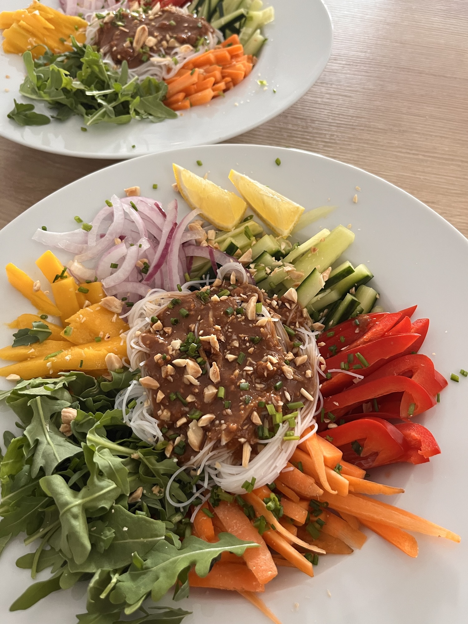 Ensalada con verduras, fideos de arroz y salsa de cacahuete