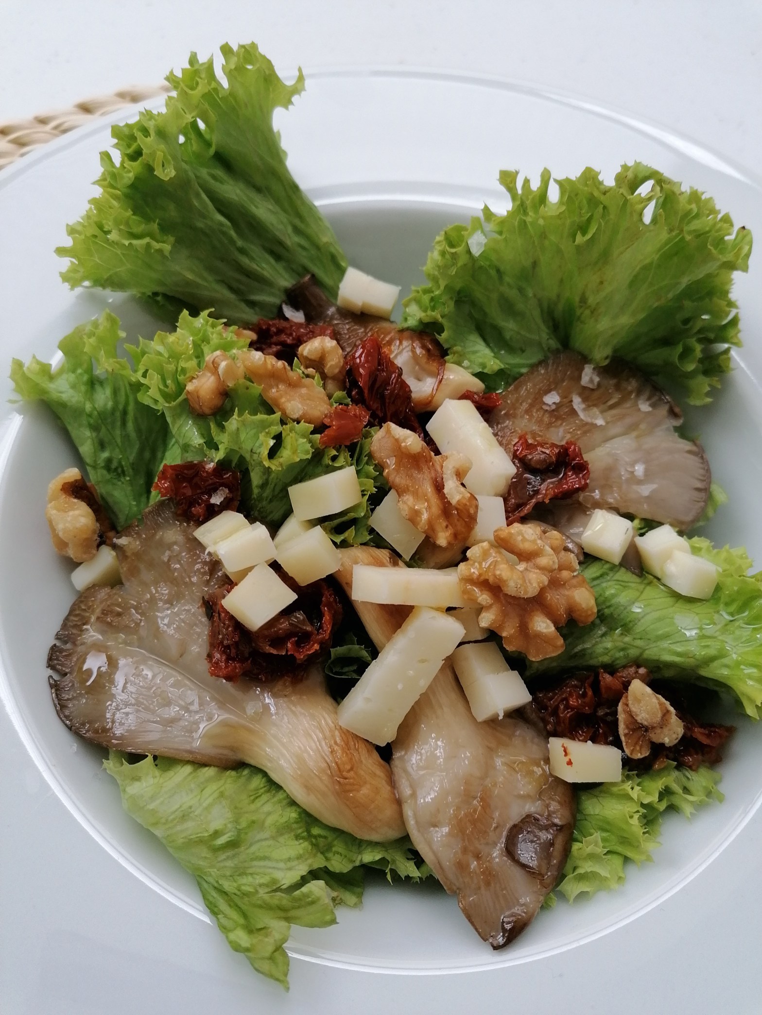 Ensalada de setas, tomate seco y nueces